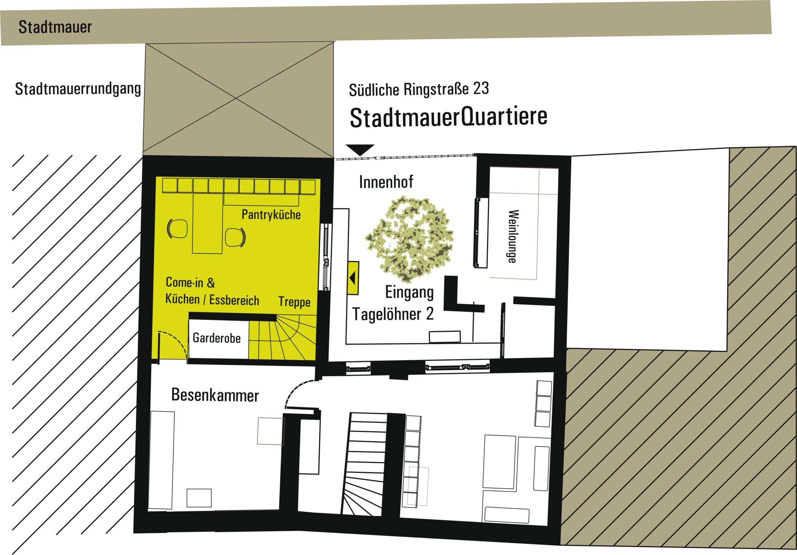 Unverputzt und ursprünglich, strahlt die Stadtmauer im Inneren des Wohnbereichs eine ganz besondere Atmosphäre aus.