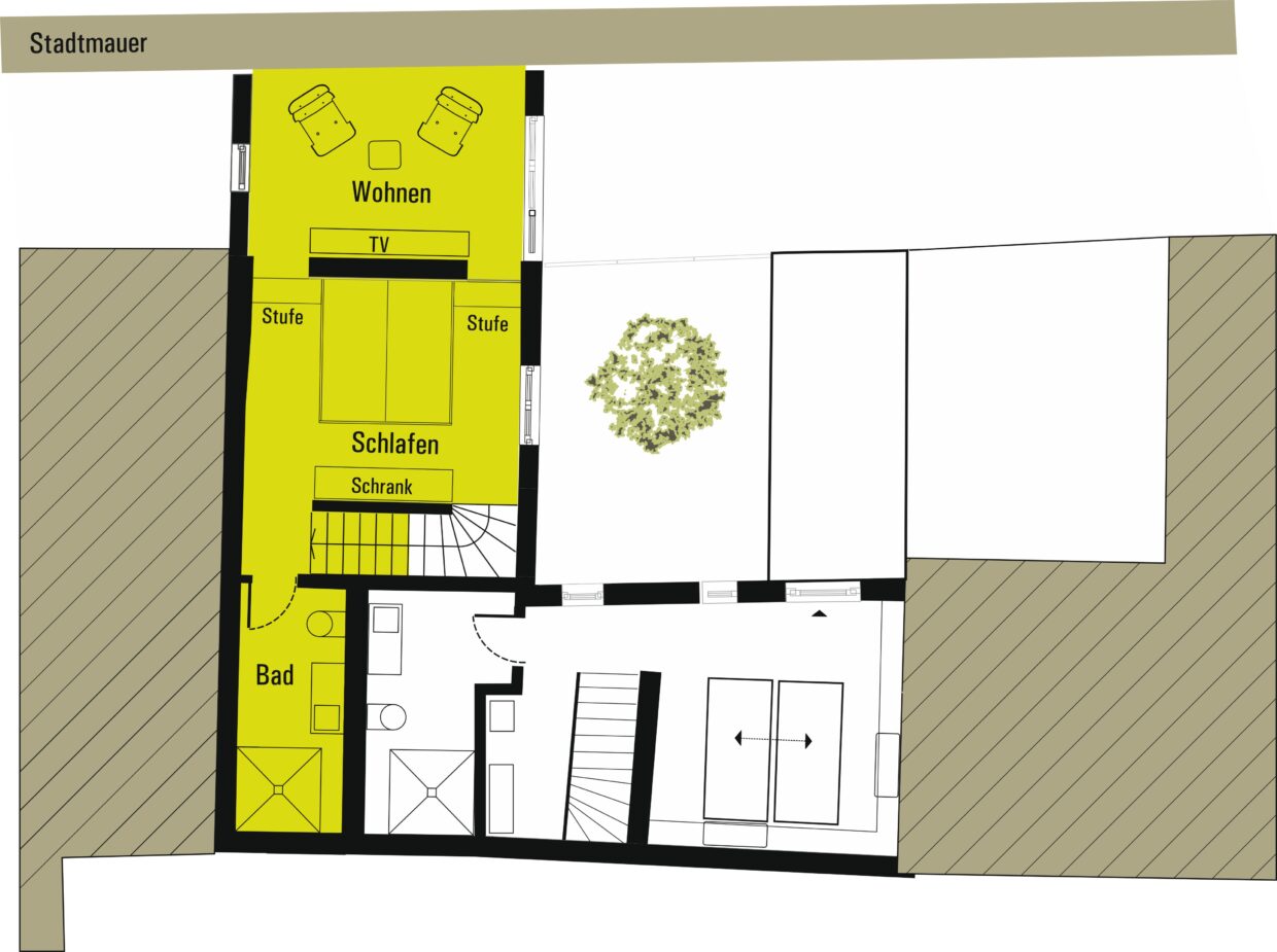 Besonderheit dieses Appartements ist der Wohnbereich im OG, der sich über den Stadtmauerrundgang spannt.