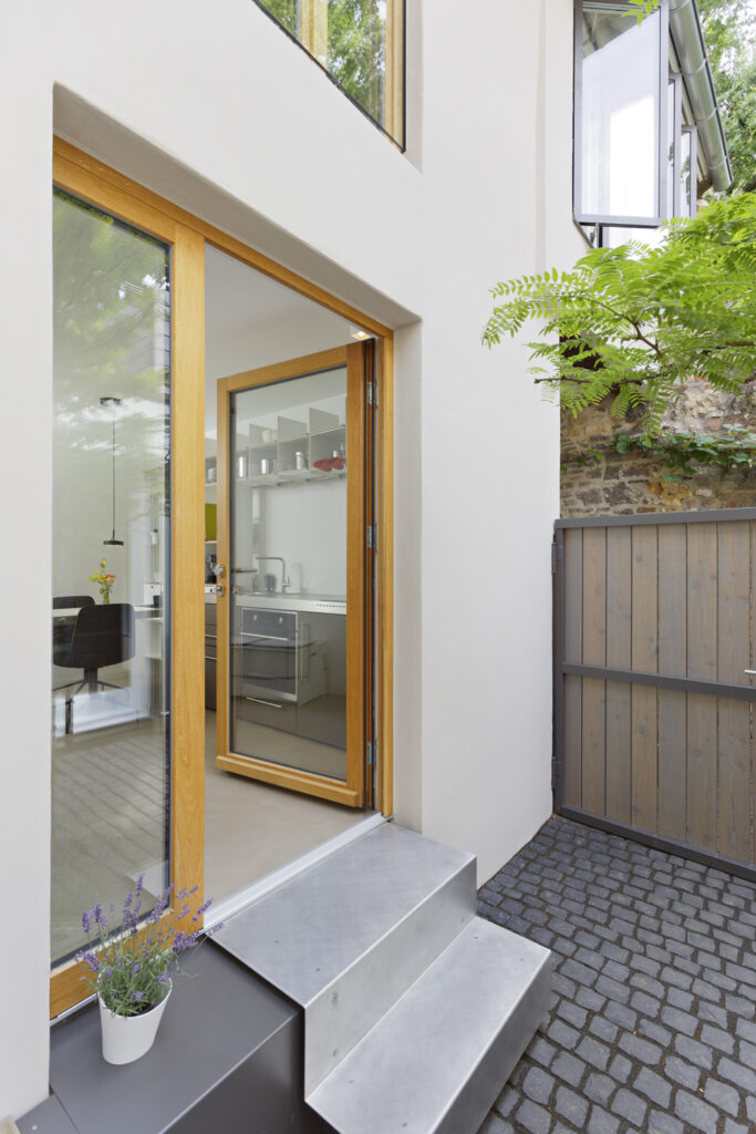 Die dreigeteilte Fensterfront in Richtung Südwesten lässt sich vollständig aufstellen. Von hier aus hat man alles im Blick – die zwei benachbarten Stadtmauertürme der Wehranlage, den Stadtmauerrundgang und den Wallgraben.