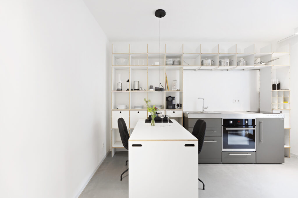 - Come-in & Küchen-Essbereich (Pantryküche, 2 Drehstühle, verschiebbarer Esstisch)